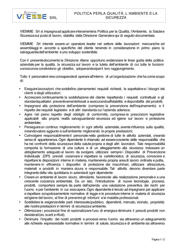 Già in corso d’opera del processo produttivo ciascun operatore certifica la qualità del prodotto mediante misurazioni continue e frequenti con il controllo statistico di processo (SPC). Questo consente di valutare la tendenza dei parametri di processo a deviare dagli intervalli di specifica e previene la fabbricazione di prodotti non conformi attraverso il tempestivo intervento dell’operatore. Viene così definita e monitorata la capability dei processi. Nei casi di lavorazione esterna, l’evidenza di conformità è a carico del subfornitore. Viene comunque eseguita un’ulteriore verifica a campione da parte del servizio di controllo in entrata, in modo da garantire che la qualità della subfornitura sia al livello di quella interna di Viemme.